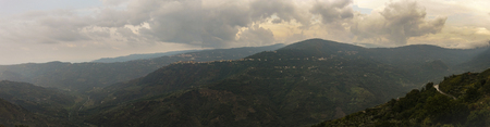 Captivating view of lush green mountains stretches across the horizon, adorned by a dramatic sky filled with clouds. Perfect for nature lovers.