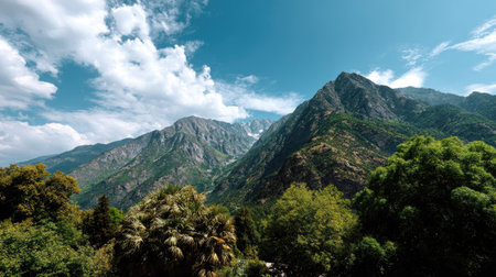 Experience the breathtaking beauty of a majestic mountain range surrounded by lush greenery, under a bright blue sky adorned with fluffy clouds. Perfect for nature enthusiasts.