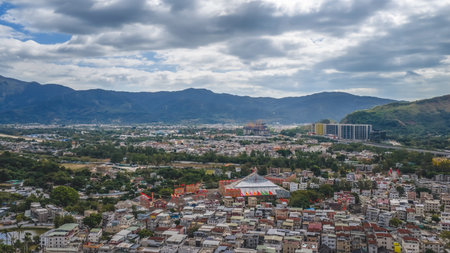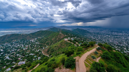Captivating aerial view showcasing lush green mountains and sprawling cityscape under a dramatic cloudy sky, ideal for travel and nature themes.