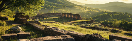 Golden sunlight illuminates the ruins of an ancient settlement nestled in the hills, surrounded by vibrant green valleys and distant mountains at sunset.