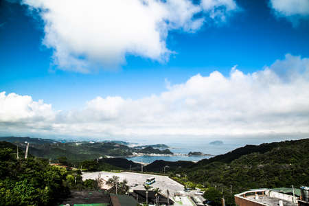 top view, parking lot among green hills and ocean in juifen. background sunny blue sky and white cloud