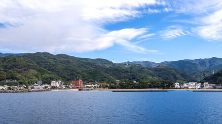 Landscape view of Mountain over blue sky and white cloud from the ferry boat in the ocean at Suruga Bay, Shizuoka, Japan