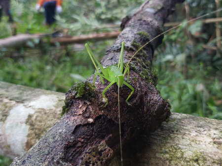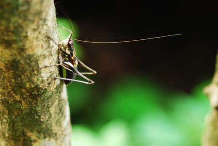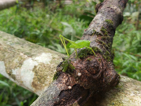 Grasshopper on a tree branch in the rainforest.