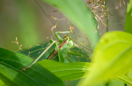 Green grasshopper sitting on leaf. Small Tettigonia viridissima with long antennae sit in grass, side view. Nymph of great green bush-cricket, soft selective focus