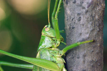 A green katydid standing on green tree bark mimics the look of a tree.