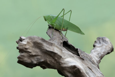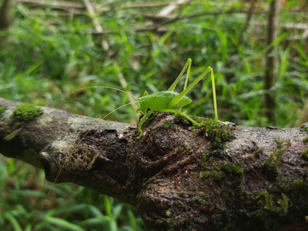 Macro shot of a short-winged conehead sitting on a log in the forest