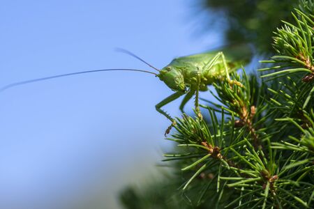 Tettigonia viridissima female sitting on the needles branches, great green bush-cricket beautiful animal posing in daylight, macro detail view