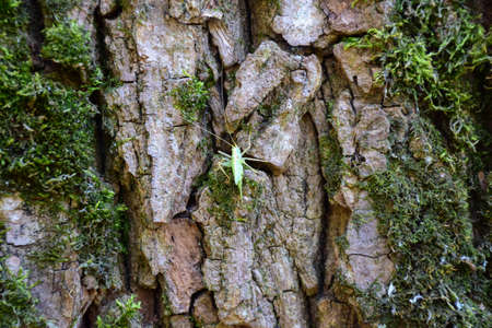 Small green grasshopper sits on the bark of a large tree