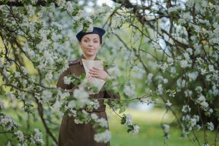 A young female pilot in uniform of Soviet Army pilots during the World War II. Military shirt and a beret. In spring blooming apple orchard