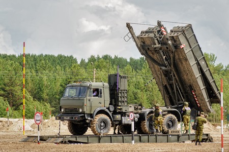 Tyumen, Russia - June 21, 2017: Army Games. Safe Route contest. Assemblage of the mechanized bridge from TMM set