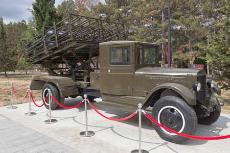 Sevastopol, Crimea, Russia - July 28, 2020: Rocket-propelled mortar BM-31-12 Andryusha on the chassis of the ZIS-12 car in the memorial complex Sapun-Gora in the hero-city of Sevastopol, Crimea