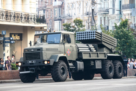 Ukrainian multiple rocket launcher Verba during a rehearsal for the Independence Day military parade in central Kyiv, Ukraine August 20, 2021. High quality photo