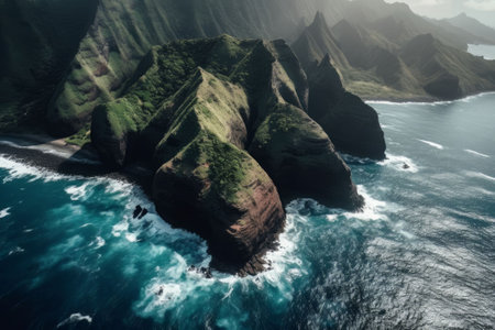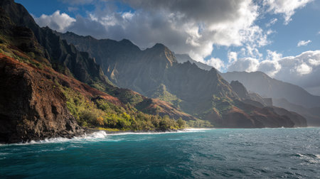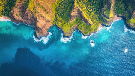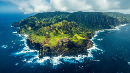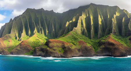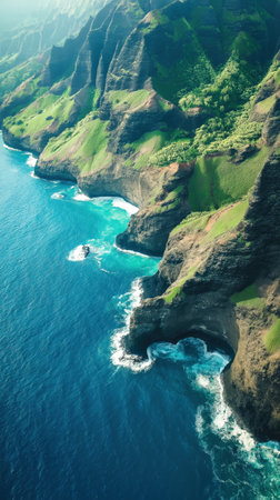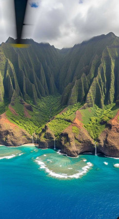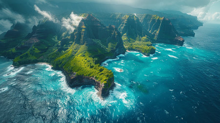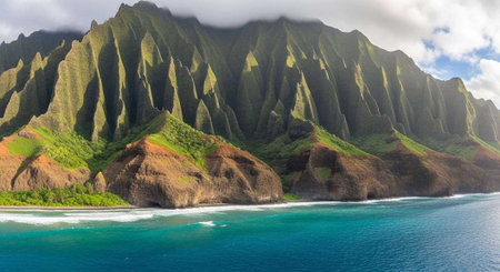Aerial view of the rugged na pali coast on Kauai Island, Hawaii, showcasing dramatic cliffs, pristine turquoise waters, and a touch of clouds