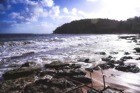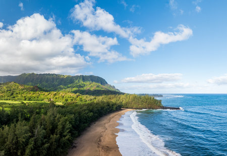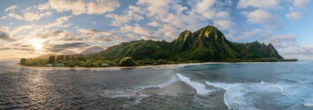 Aerial panoramic image off the coast over Lumahai beach on Hawaiian island of Kauai with Na Pali mountains behind. Taken at dawn