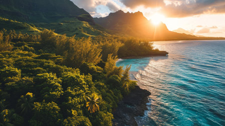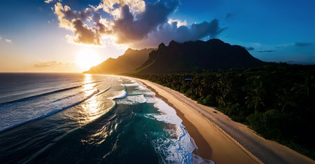 Generative AI Coastal enchantment, drone's perspective, sun on horizon, breathtaking vistas, immersive and detailed sunset over French Polynesia