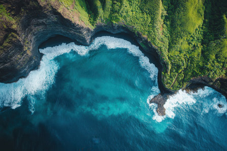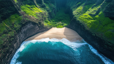 An overhead shot depicts a serene beach embraced by towering green cliffs. Turquoise waters gently meet a sandy shore under bright sunlight. The landscape features contrasting textures and colors, creating a visually striking composition. This scene is suitable for travel, nature, or environmental themed commercial projects.