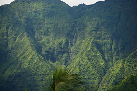 waterfall on the NaPali Coast of the island of Kauai from the town of Hanalei