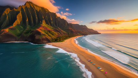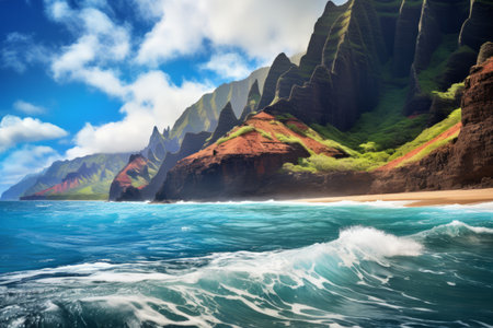 Stunning view of the na pali coast with its rugged cliffs, turquoise water, and sandy beach