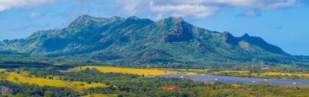 Panoramic view of the taro fields in the Hanalei valley from Princeville overlook in Kauai in Hawaiian islands in high resolution