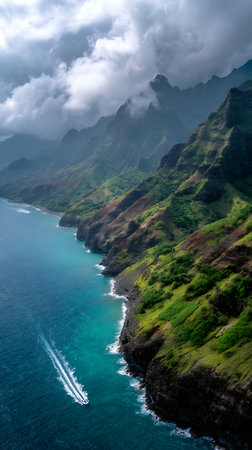 Aerial view of Na Pali Coast, Kauai, featuring lush green mountains shrouded in clouds along the coastline. A boat speeds through the turquoise waters beside the rocky shore.