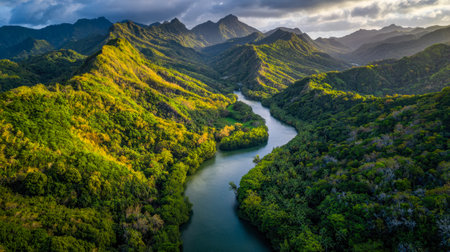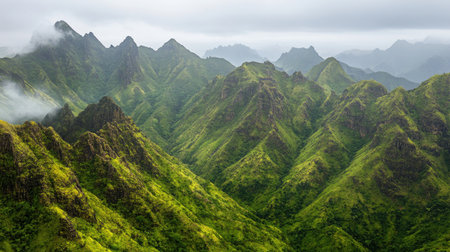 Experience the breathtaking beauty of lush green mountains under a cloudy sky, showcasing rugged terrain and vibrant foliage in a serene tropical landscape.