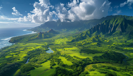 Discover a stunning aerial view of a lush coastline where dramatic mountains meet vibrant ocean waves under a dynamic sky, offering a serene escape.