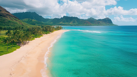 Serene Tropical Beach with Turquoise Waters and Lush Green Mountains Under a Bright Blue Sky in a Scenic Coastal Landscape