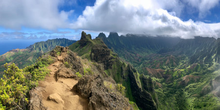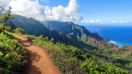 Explore a stunning coastal trail surrounded by lush greenery and towering mountains, offering breathtaking views of the ocean and sky. Perfect for nature lovers.