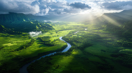 A breathtaking aerial view of lush green valleys with sunlight breaking through the clouds