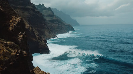 Rugged cliffs rise majestically from the ocean, where waves crash against the rocks. Clouds gather overhead, creating a dramatic twilight atmosphere at the shoreline.