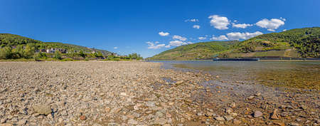 Panoramic image over the half-dried Rhine with barge in the navigation channel