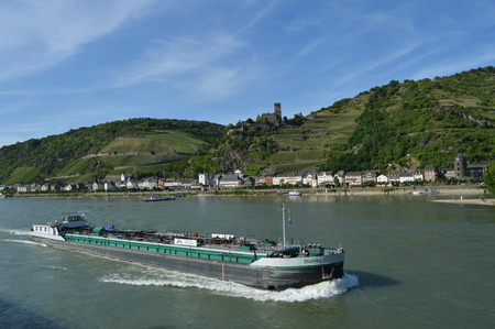 Panoramic view of Sank-Goar and Snak Goarshausen medival village and Rhine vineyards on slope of the hills in Germany. Cargo ship sails on the Rhine river.