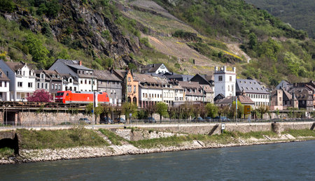 Sankt Goarshausen, Germany - August 11, 2018: Sankt Goarshausen Town on Rhine River, romantic Rhine valley landscape at beautiful summer day in Germany.