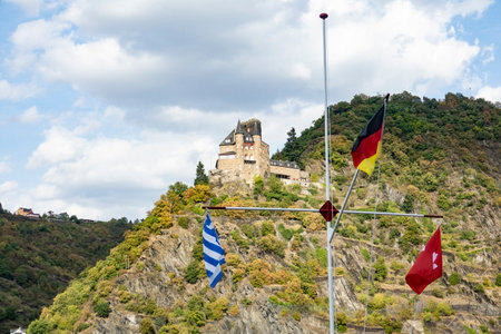Romantic Burg Katz with flags in Rhine Valley in germany