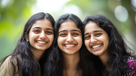A vibrant image of three smiling Indian students engaged in a group project outdoors, showcasing joy and collaboration in educational activities against a beautiful natural backdrop.
