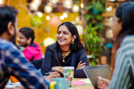 Young Indian businesswoman sitting at table in cafe and talking with colleagues.