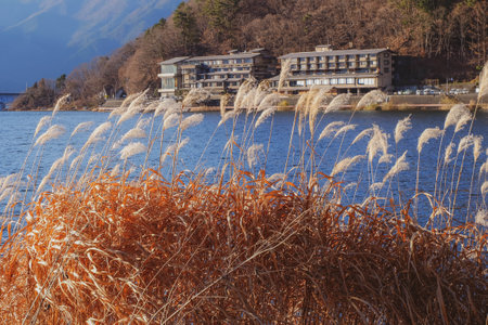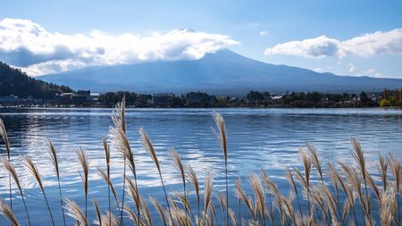 Landscape of Fuji Mountain and grass flowers beside lake in the morning at Kawaguchi Lake, Yamanashi, Japan