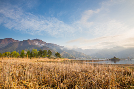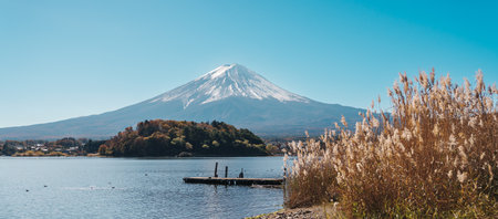 An idyllic view on Mt Fuji from the side of Kawaguchiko Lake, Japan. The volcano is surrounded by clouds. Dried, golden grass on the shore of the lake. Serenity and calmness. Bright and clear day.