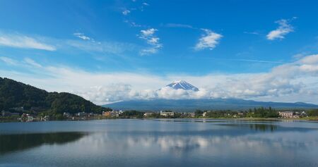 Fuji Mountain snowcapped and Lake kawaguchiko Japan, blue sky and clouds in Spring