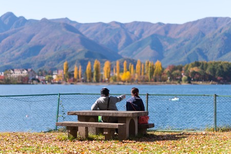 YAMANASHI, JAPAN - NOVEMBER 03, 2014: Unidentified people sit in front of Lake Kawaguchi, located in Fujikawaguchiko, southern Yamanashi Prefecture near Mount Fuji, Japan.