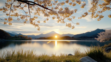 A serene sunrise over Mount Fuji, framed by cherry blossoms and mountains