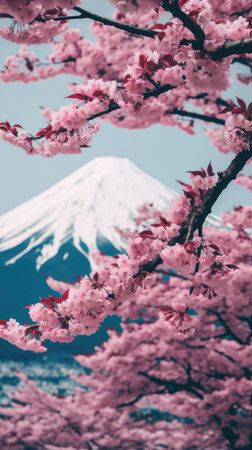 A majestic snow-capped Mount Fuji stands tall in the distance, framed by a vibrant display of delicate pink cherry blossoms. The gentle breeze carries petals through the air, creating a dreamy, ethereal scene.