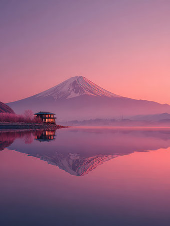 A stunning view of Mount Fuji reflected in serene waters at sunrise, showcasing vibrant pink hues. A peaceful landscape that captivates nature lovers and travelers alike.