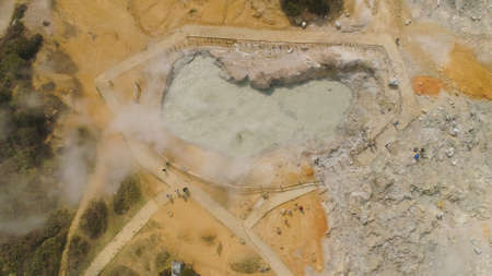 plateau with volcanic activity, mud volcano Kawah Sikidang, geothermal activity and geysers. aerial view volcanic landscape Dieng Plateau, Indonesia. Famous tourist destination of Sikidang Crater it still generates thick sulfur fumes.