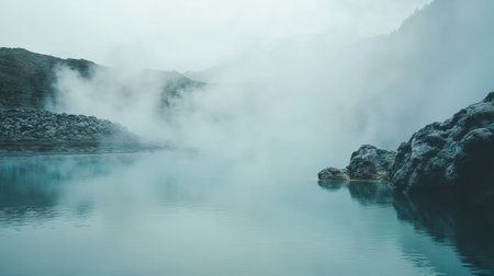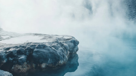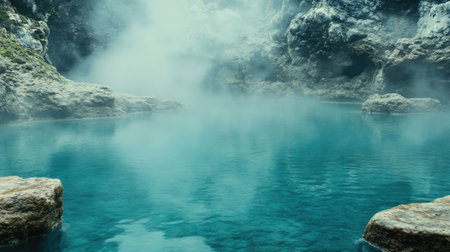Steam gracefully rises from a serene hot spring, surrounded by jagged rocks, creating a peaceful atmosphere in natures embrace.