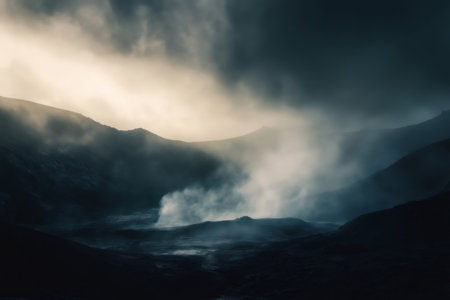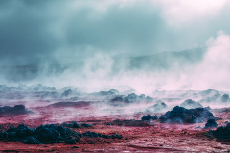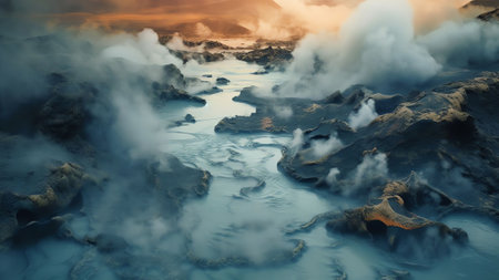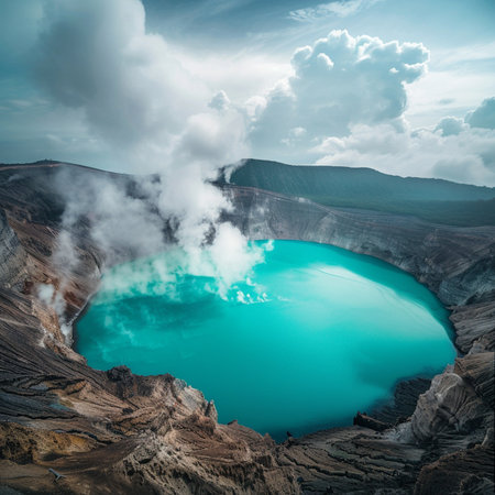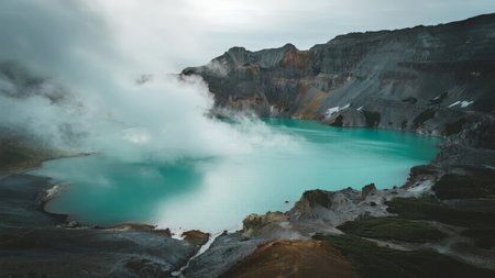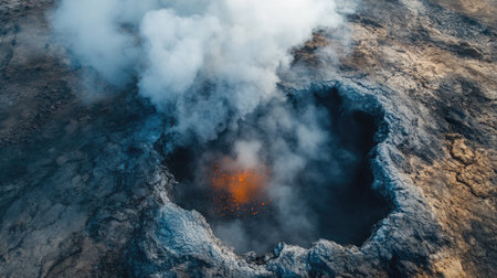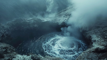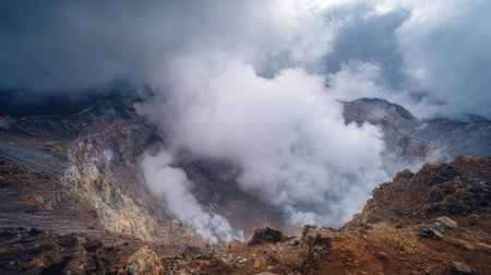 Breathtaking view of volcanic crater shrouded in mist and steam, showcasing rugged terrain and dramatic geological features. atmosphere is filled with sense of awe and natural power