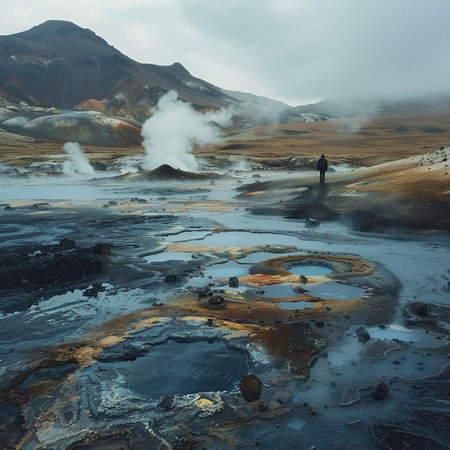 Geothermal energy wells releasing steam in volcanic landscapes, tapping into the Earth's heat.