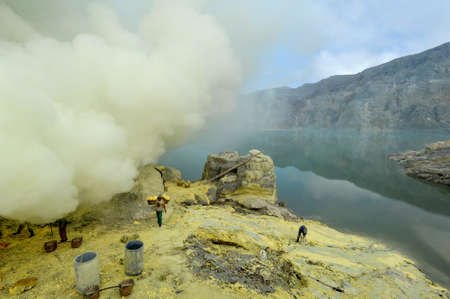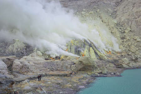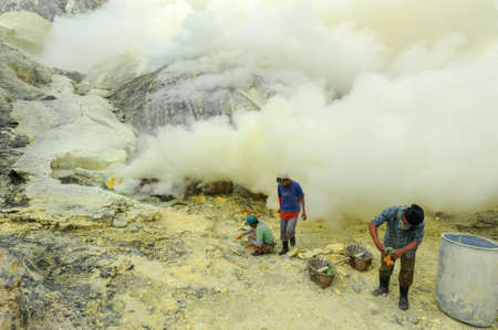 Ijen Volcano, Indonesia - April 1, 2018: Workers mine sulfur from the crater of the volcano