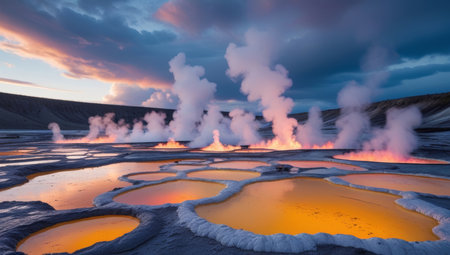 A stunning landscape featuring geothermal activity, with steaming vents and vibrant orange pools reflecting a colorful sunset sky. The scene captures a unique, otherworldly beauty, showcasing nature's raw power and tranquil vastness.