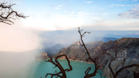 Beautiful sunrise at Kawah Ijien volcano in Indonesia, toxin sulphur lake, dead trees on top of the mountain, soft focus, adventure travel concept, mountain landscape, hiking the volcano